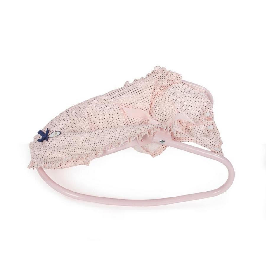 Шезлонг для куклы из серии "Шарлотта" розового цвета в мелкий темно-синий горошек. Подходит для кукол до 42 см. Оборудован ремнем.