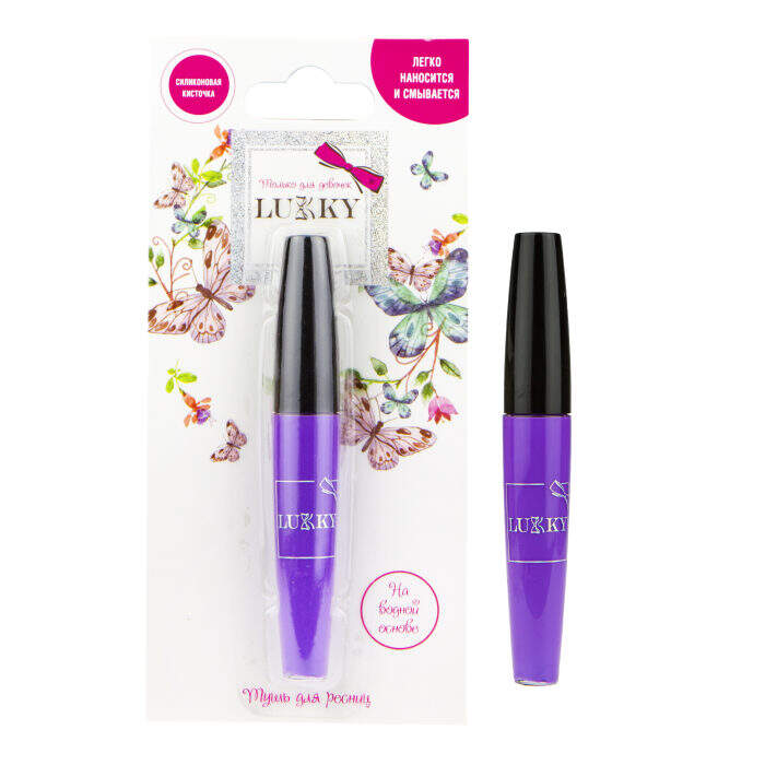 Тушь для ресниц LUKKYцвет фиолетовый. Удлините свои ресницы с помощью туши LUKKY. Силиконовая щёточка охватывает ресницы по всей длине, приподнимает и вытягивает их, аглубокий фиолетовый пигментам обеспечивает равномерное покрытие по всей длине ресниц. Тушь следует наносить аккуратными зигзагообразными движениями по направлению роста ресниц, как бы вытягивая их, – так вы добьётесь тщательно прокрашенных, разделённых и объёмных ресниц.