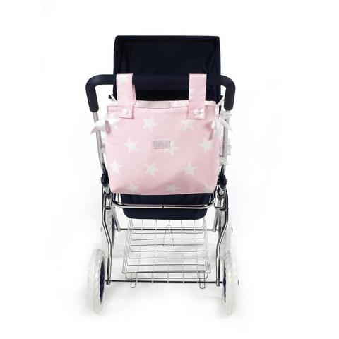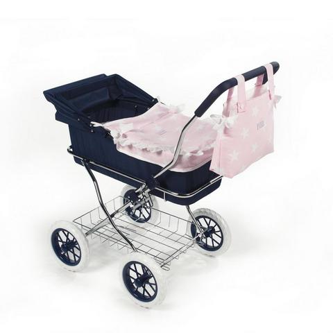 Коляска выполнена в темно-синем цвете с розовыми аксессуарами, с принтом "звездочки".