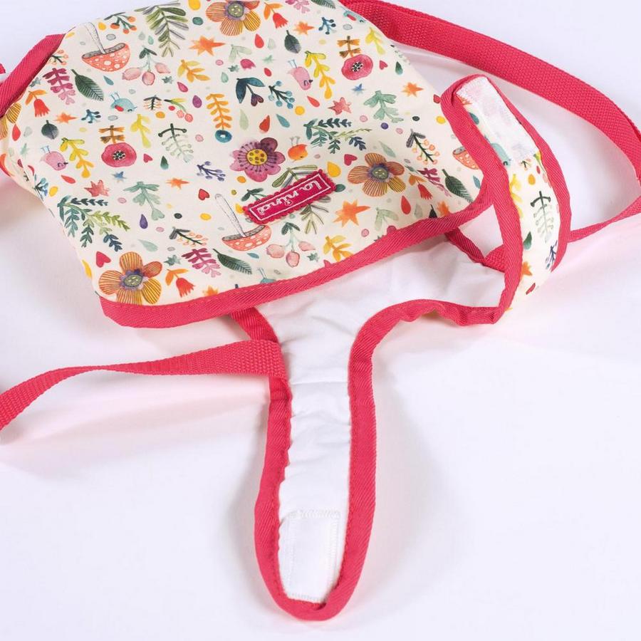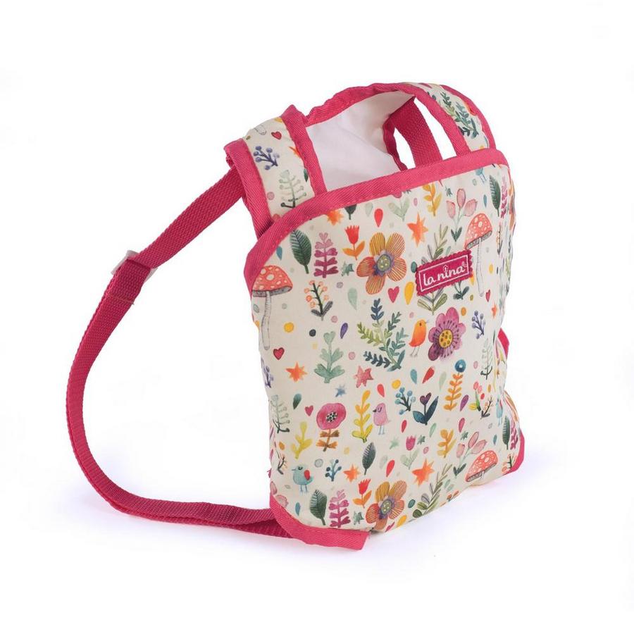 Рюкзак-переноска для куклы из серии "Валерия" выполнена из текстиля в ярких тонах с растительным акварельным узором и красной окантовкой. Подходит для кукол до 46 см.