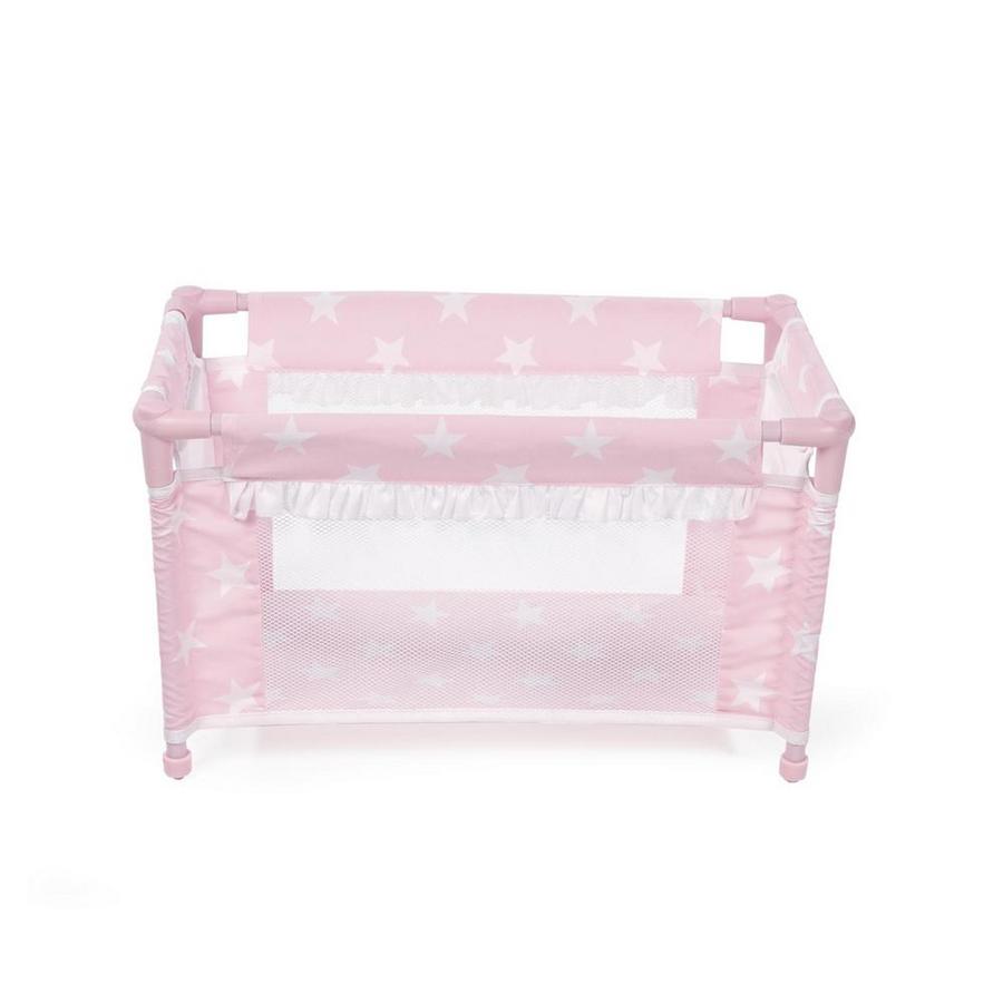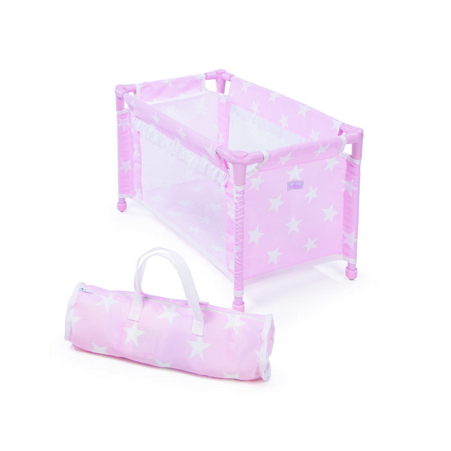 Походная кроватка-манеж для кукол из серии "Карлота" розового цвета с белыми звездочками. Кроватка полностью разборная, убирается в небольшую сумочку.