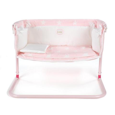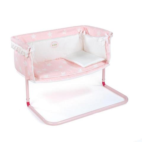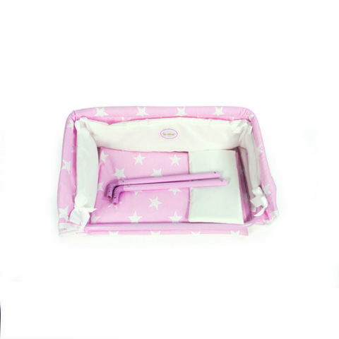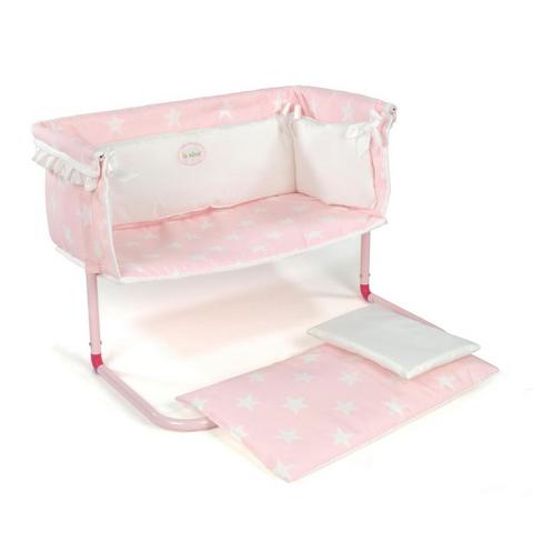 Прикроватная кровать для куклы из серии "Шарлота" розового цвета с белыми звездочками. В комплекте постельное белье. Легко складывается.