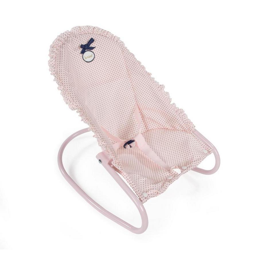 Шезлонг для куклы из серии "Шарлотта" розового цвета в мелкий темно-синий горошек. Подходит для кукол до 42 см. Оборудован ремнем.