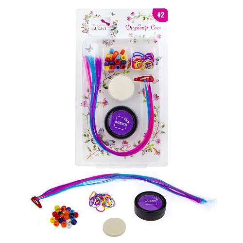 Дизайнер-Сет для волос от LUKKY включает в себя цветную прядь для волос на заколке, фиолетовую пудру для волос со спонжем для нанесения, бусины для волос и резинки для волос.